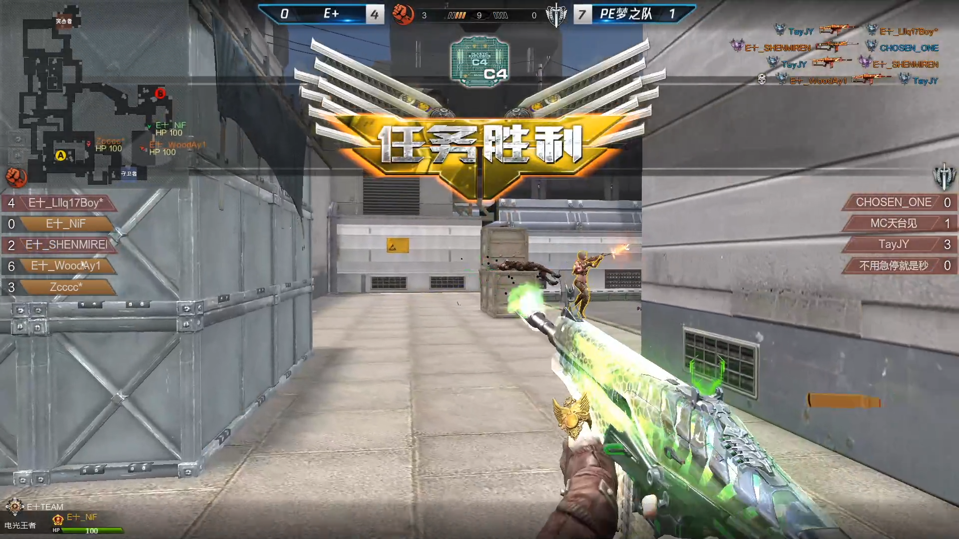 第三图监狱,PE梦之队率先担任守卫者,E+上半场打的很稳, PE梦之队反而显得有些急躁,上半场PE梦之队5-4领先;下半场换边,PE梦之队的战术执行非常完美,最终PE梦之队以10-7的比分拿下比赛胜利,大比分2-1战胜E+。
