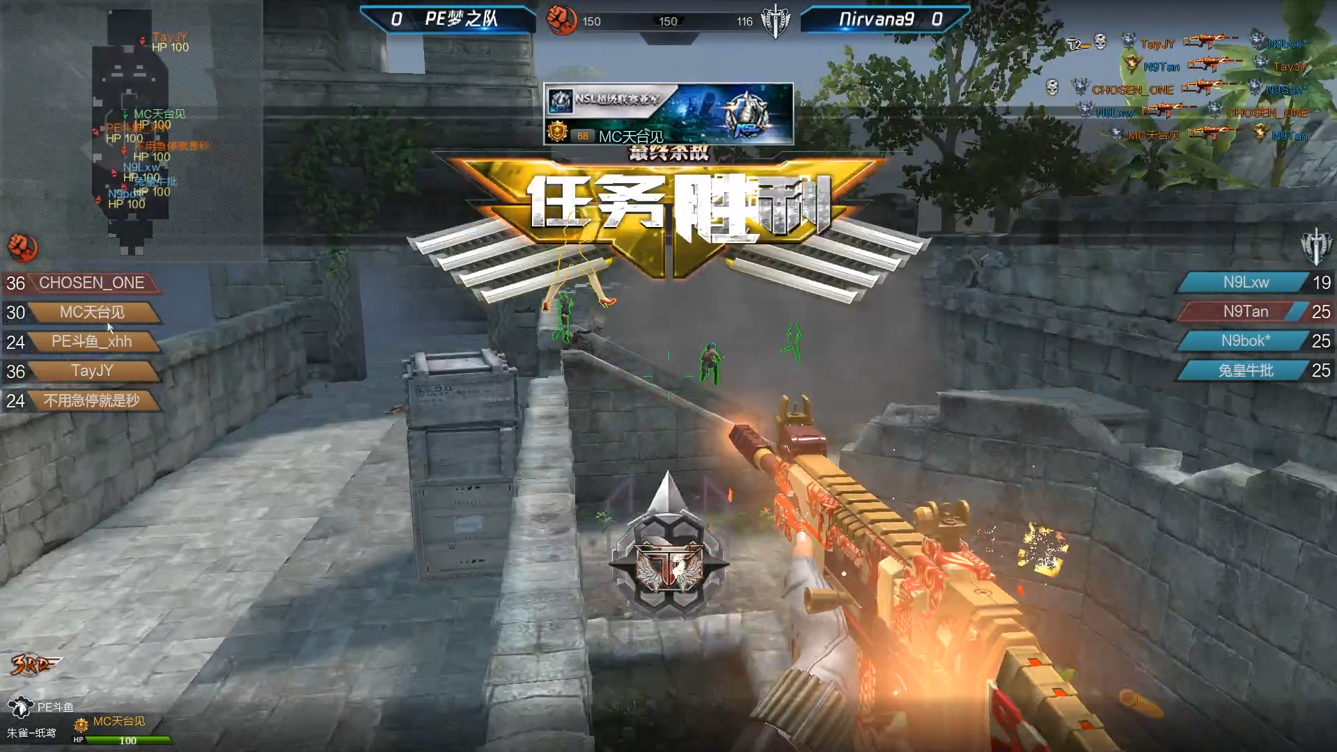 第二场比赛的对战双方是N9和PE梦之队,比赛地图顺序为玛雅花园-海滨小镇-监狱,第一图玛雅花园PE梦之队担任突击者, PE梦之队枪法依旧火热,除了开局被刷屏之外后面的节奏都掌握在PE梦之队手里,N9枪法弱势,最终PE梦之队以150-116的比分拿下第一图,大比分1-0领先;