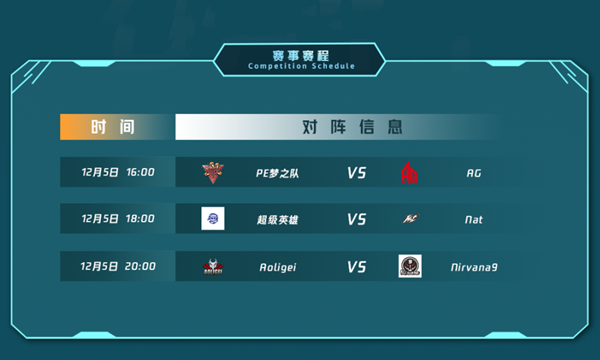 作为首个比赛日,12月5日将会进行三场比赛,揭幕战由PE对阵AG,这是一场宿命之战,也是一场承上启下的比赛,相信经历过S5赛季的小伙伴们应该都会对最终决战记忆犹新吧。此番老对手再聚于S6的揭幕战,这场比赛必定会被赋予更多额外的意义。同日的第二场比赛,两支新兴战队将会在逆战最顶级的舞台上一展身手,他们分别是超级英雄战队和NAT战队。在赛前的采访中,他们都表现出了强烈的斗志。首日的最后一场比赛是Aoligei战队对阵Nirvana9战队。其中Nirvana9曾经在不久前与AG有过交锋,在团队竞技中虽然最后惜败,但是仅11分的分差说明他们的势力不容小觑。
