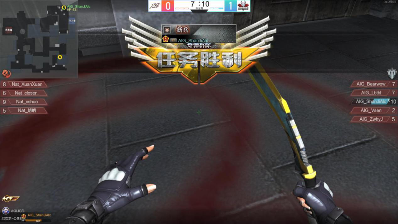 AIG率先担任进攻方,NAT担任守卫方。NAT拿到首分,AIG很快追平。通过短暂的调整,AIG接管比赛节奏,进攻连连得分,残局也稳健拿下,以5-1领先。NAT防守通过个人能力的发挥也有得分,但上半场3-7落后。换边后,NAT进攻张弛有度,将比分追至6-7。此时AIG终于抓到对手漏洞,连拿残局以10-7拿到赛点。最后一波ShanJiAlc四杀灭队,AIG以11-7战胜NAT取得胜利。