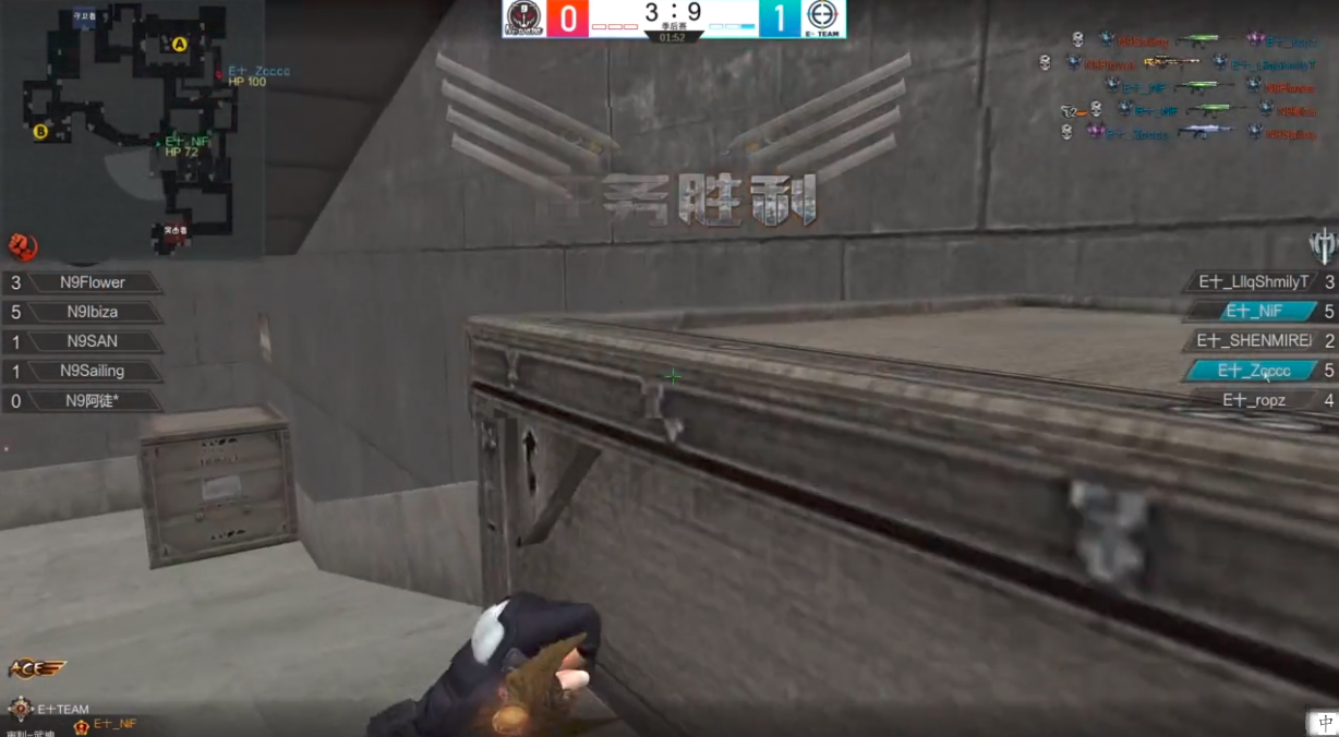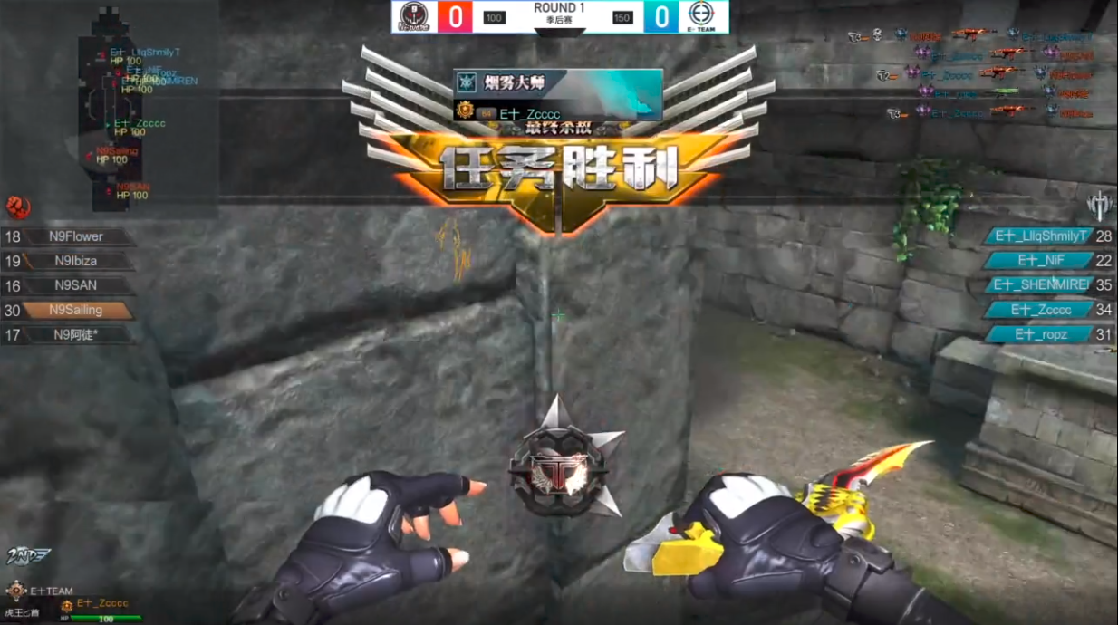 N9担任进攻方,E+担任守卫方。比赛初期,E+就建立10多个人头优势,SHENMIREI率先突破10击杀,N9全员不在状态。E+趁胜追击,全面压制对手,N9非常被动,只能守家,比分67-43。双方枪法差距有点大,E+以100-61领先,40多个人头差距,几乎已经确定结局。最终E+以150-100战胜对手取得胜利,N9几乎被封百,这也是整个赛季团队模式比分最悬殊的一次。