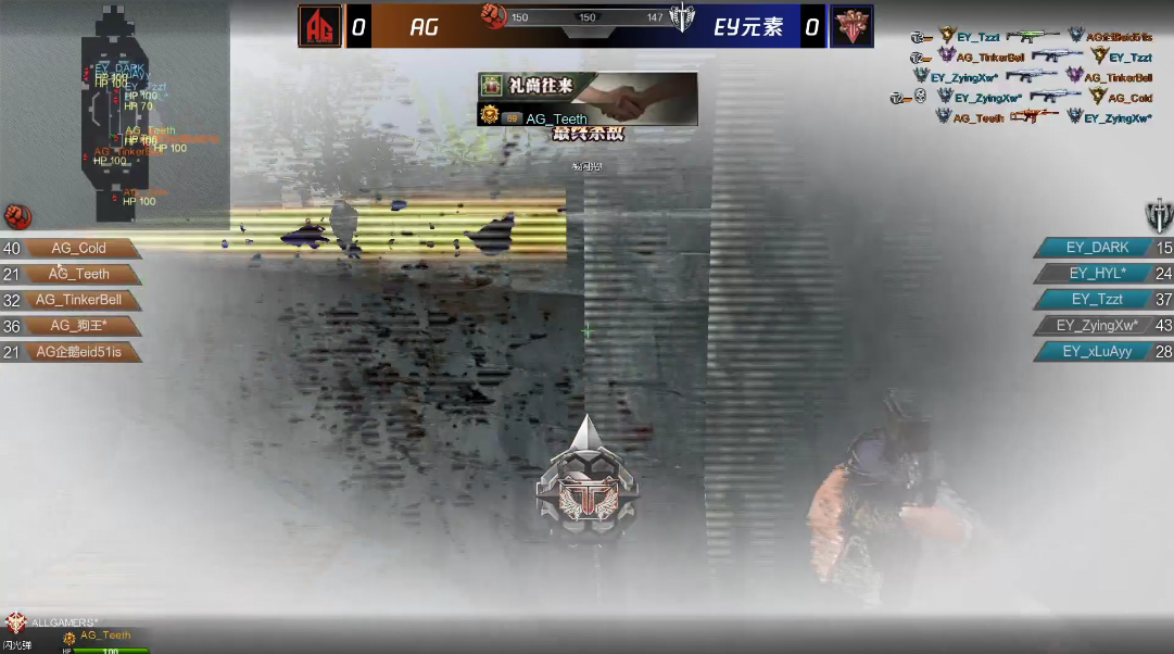 第一图玛雅花园,AG担任进攻方,EY担任守卫方。AG延续上一场比赛的火热手感,一上来就是人头领先,8-2。EY想要追分但被压制,只能紧咬分差,人头差已经来到10个。最可怕的是此时Teeth还是零杀,如果他也慢慢进入状态,AG将更加压制对手。比赛过半的时候,比分75-74,EY靠着两人发挥逐渐追平比分。击杀过百的时候,AG又一次领先几个人头,但两队分差并不大。最终两队经过激烈厮杀,AG以150-147险胜EY元素。